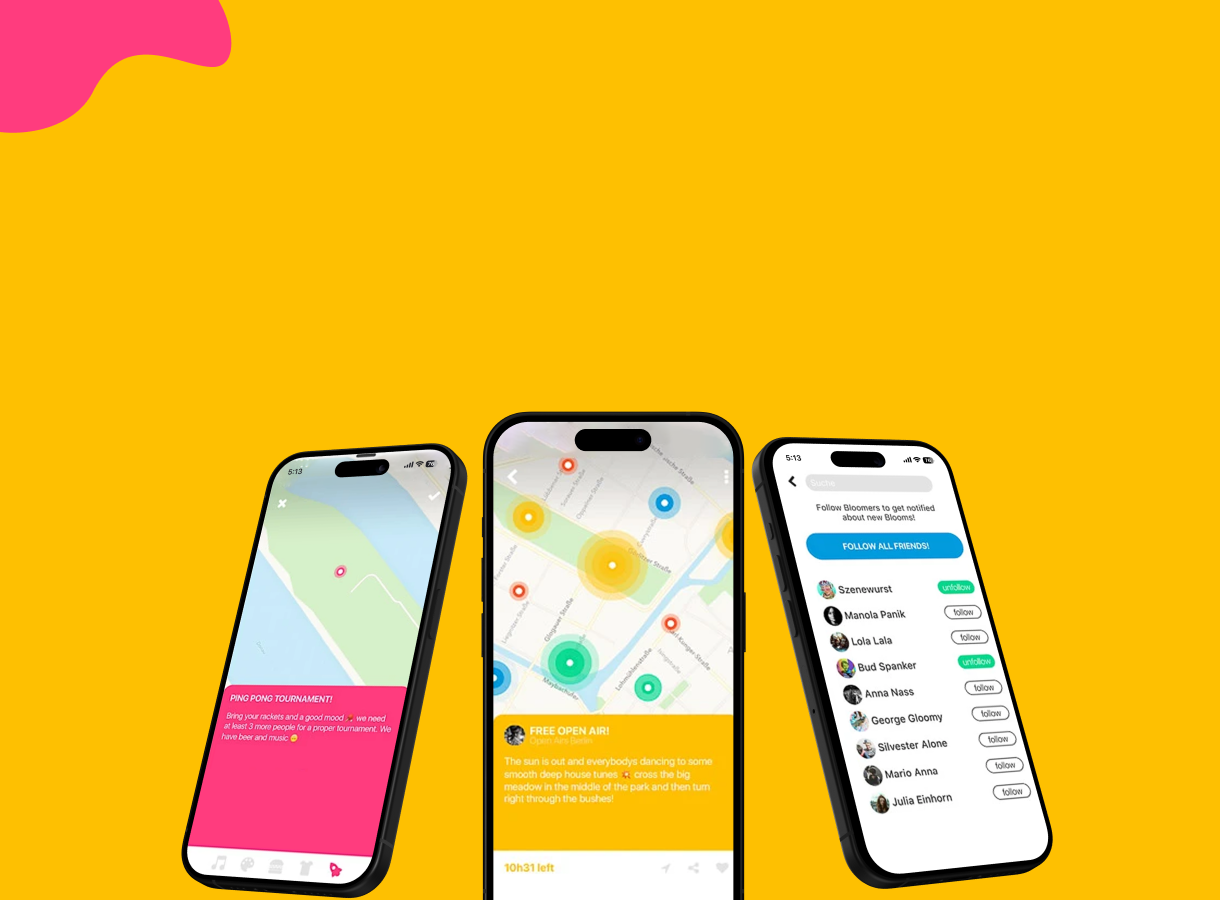 Die Bloom App zeigt Live-Events in großen deutschen Städten mit Echtzeit-Besucherzahlen auf einer interaktiven Karte. Ein CMS für Veranstalter ermöglicht das Verwalten von Events, während das Backend als Cloud-Service auf AWS gehostet wird.