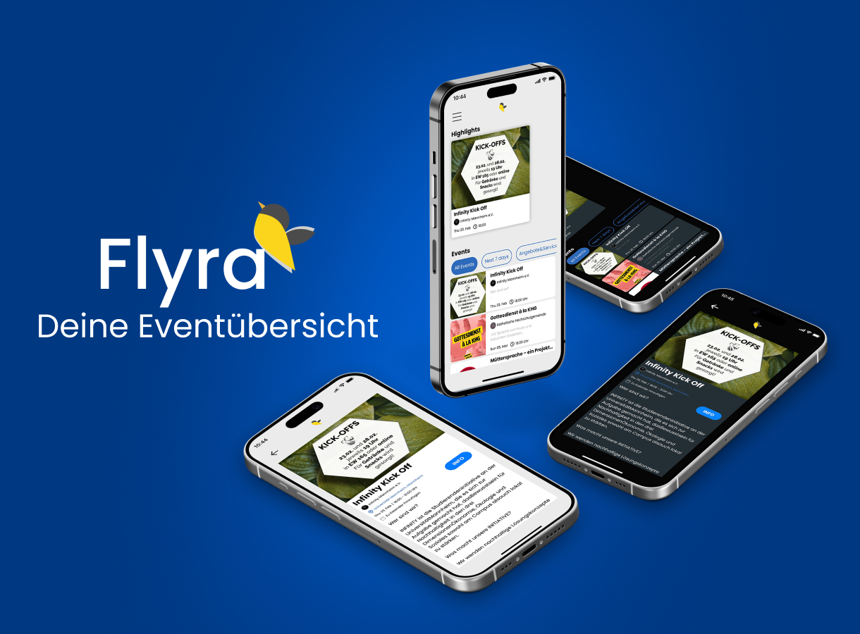 Entwickelt mit Kotlin Multiplatform für iOS und Android, verwaltet Flyra Events über ein leistungsstarkes CMS in TypeScript. Veranstalter können Events hochladen, Push-Benachrichtigungen versenden und Nutzer jederzeit auf dem Laufenden halten.