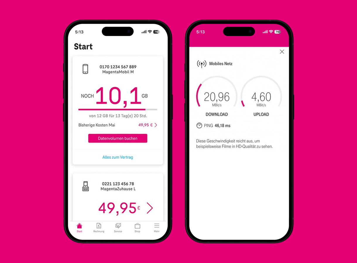 Die Mein Magenta App bietet eine zentrale Übersicht über Tarife, Rechnungen und Verträge. Nutzer können ihre Router einrichten, WLAN-Einstellungen verwalten und mit dem integrierten Speedtest die Internetgeschwindigkeit prüfen.